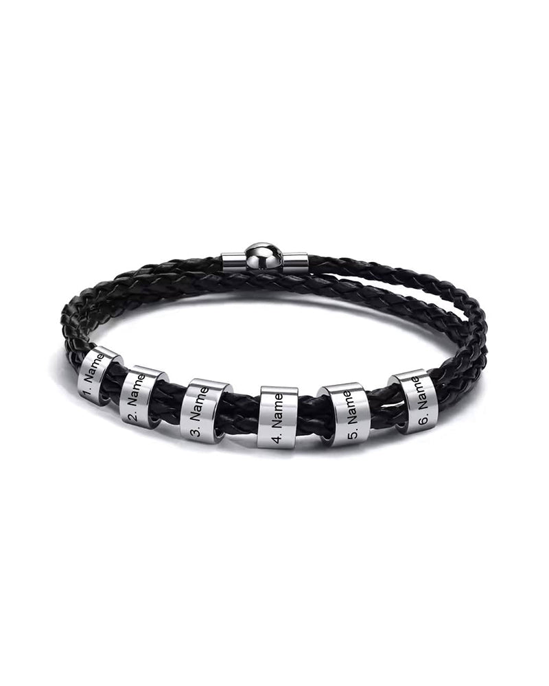 This personalized bracelet features a unique design with a braided band and an elegant, sturdy clasp. The round beads can be engraved with a personalized message.