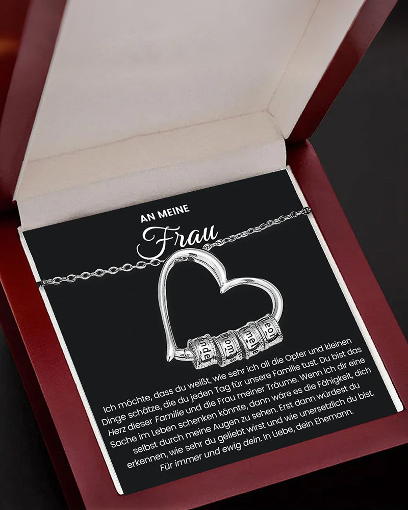 Eine personalisierte Kette in verschiedenen Ausführungen (Gold/Silber) und gravierten Namen für ihre ganze Familie. Bis zu Sechs Namen finden auf dem Tropfenförmigen Platz.